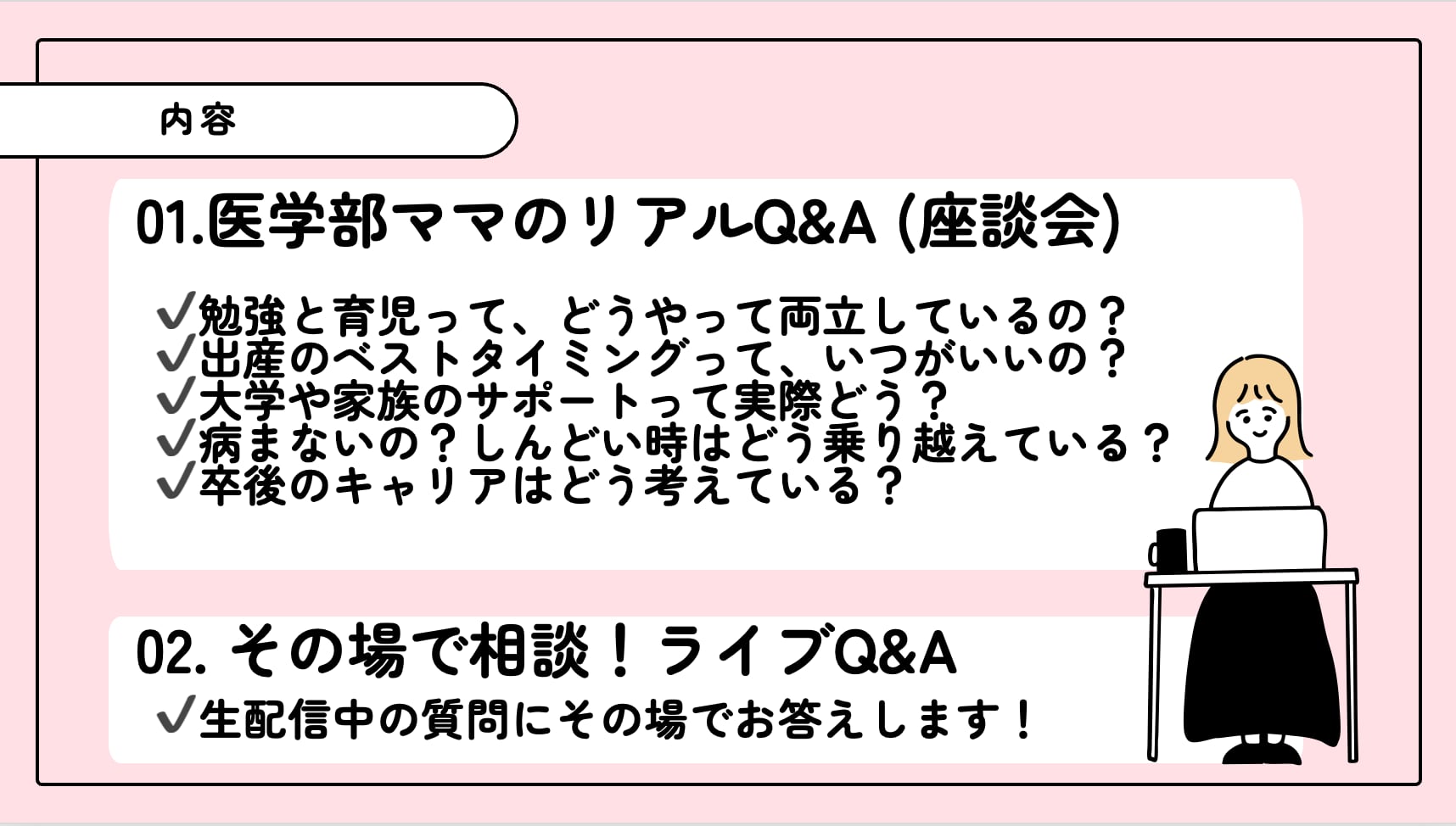 ママ医学生をパネラーとしたフランクな座談会です。リスナーの方々からの質問もその場で受け付けるインタラクティブな座談会を想定しています。