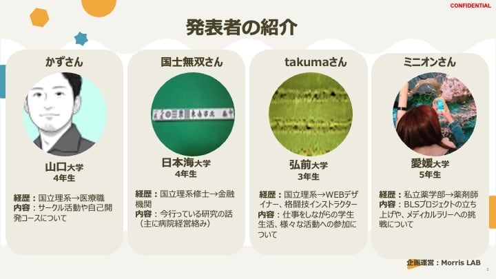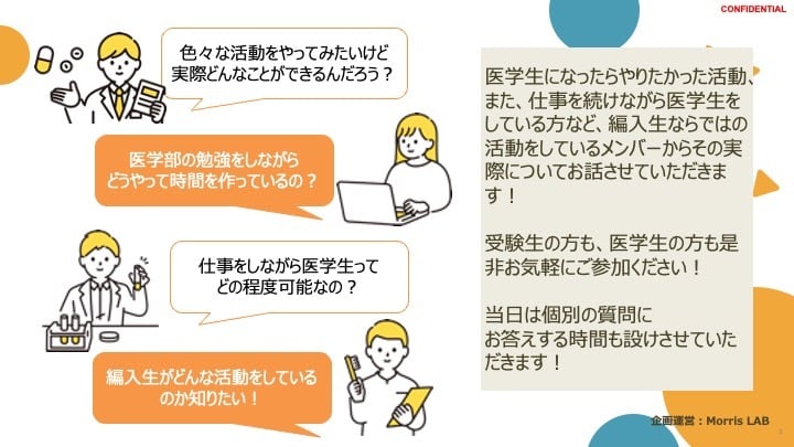 このセッションでは、医学部に学士編入した学生による活動報告が行われます。様々な魅力的な背景を持つ現役医学生が、入学後にどのような活動を行なっているかをプレゼンテーションします。